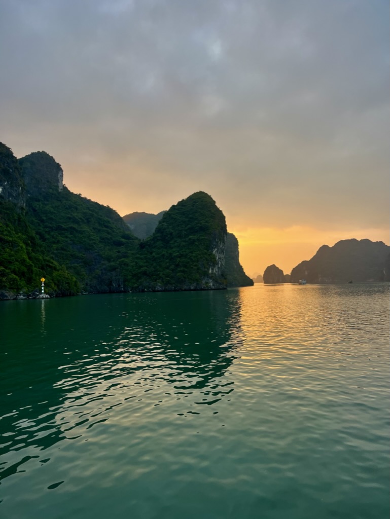 Continuing into the afternoon, we went to another island, where we hiked to a temple. The sun began to set on our descent, and we jumped into the ocean as the sky transformed into a warm orange. We returned to the boat as the sun set behind the tall karsts.
